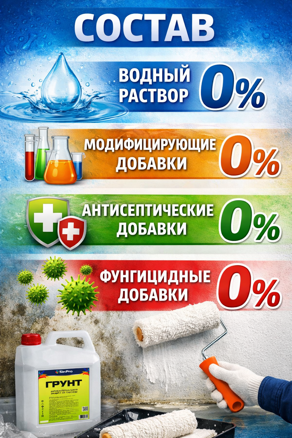 | Состав | водный раствор 0%; модифицирующие добавки 0%; антисептические добавки 0%; фунгицидные добавки 0% |